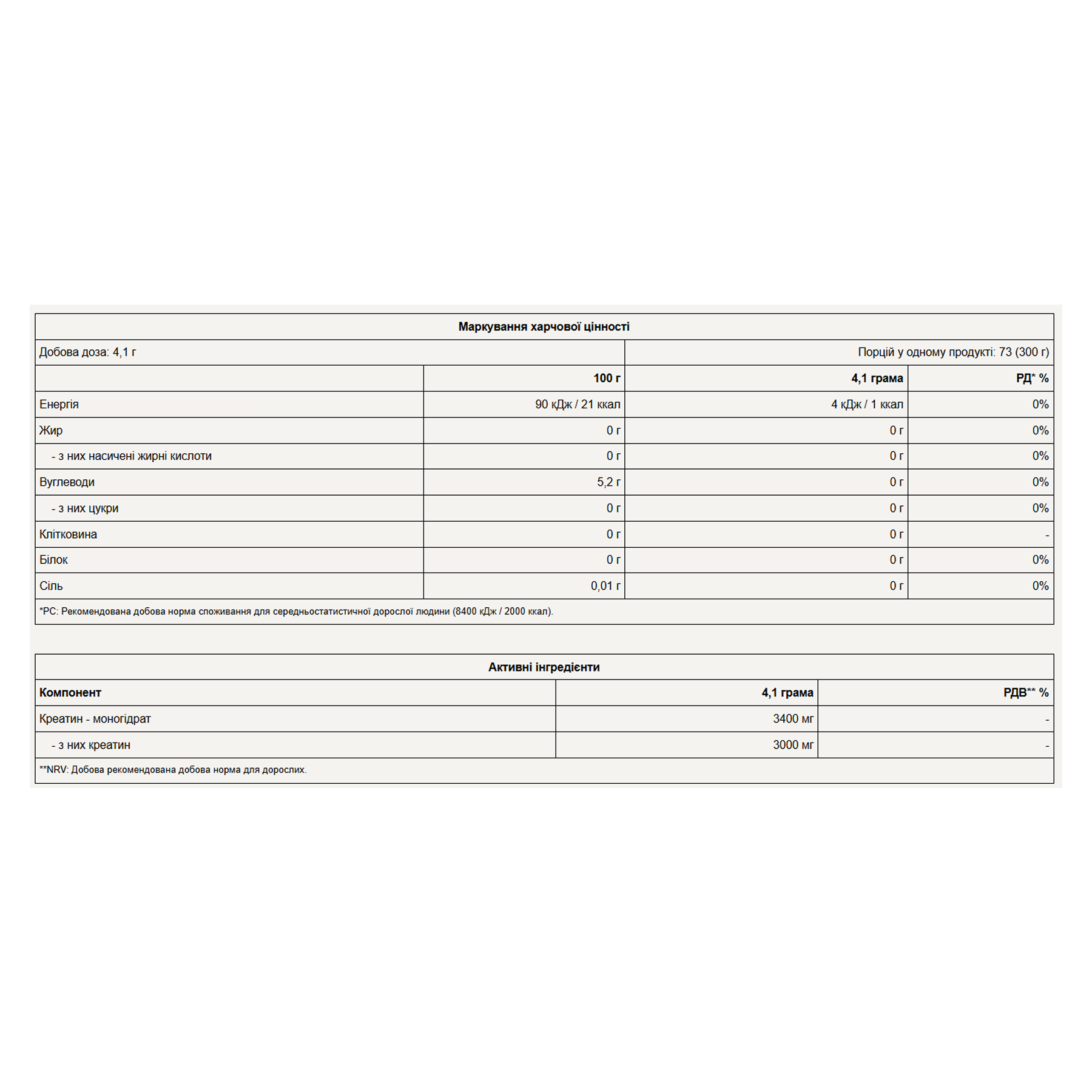 Без цукру: Відповідно до рекомендацій щодо дозування, вміст цукру у готовому до вживання продукті, приготованому з водою, становить менше 0,5 г цукру/100 мл. Без жиру: Відповідно до рекомендацій щодо дозування, вміст жиру у готовому до вживання продукті, приготованому з водою, становить менше 0,5 г/100 мл. Покращення фізичної працездатності: Креатин підвищує фізичну працездатність під час коротких, безперервних, високоінтенсивних фізичних навантажень. Корисний ефект досягається при щоденному вживанні 3 г креатину.