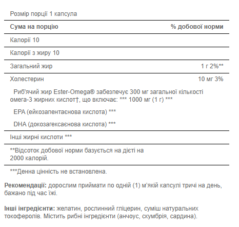 Інші інгредієнти: желатин, рослинний гліцерин, натуральні змішані токофероли. Містить рибні інгредієнти (анчоуси, оселедець, скумбрія, сардини).